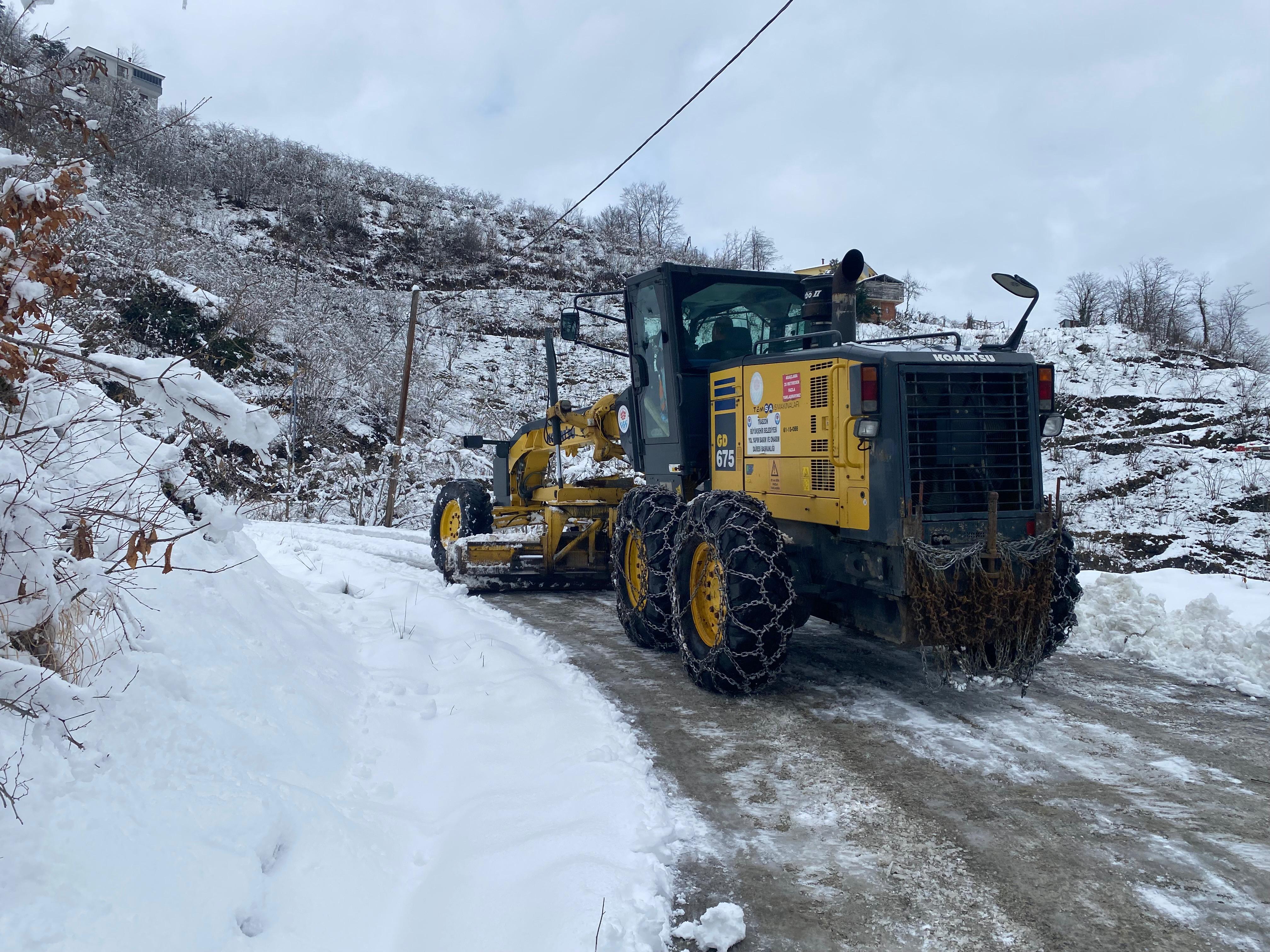 BÜYÜKŞEHİR EKİPLERİ KARLA MÜCADELEYİ SÜRDÜRÜYORTrabzon’un yüksek kesimlerinde etkili olan kar yağışı nedeniyle 34 mahalle yolu ulaşıma kapandı. Büyükşehir Belediyesi ekiplerinin yol açma çalışmaları sürüyor.Trabzon Büyükşehir Belediyesi ekipleri, ulaşımda aksama yaşanmaması ve vatandaşların mağdur olmaması için karla mücadele çalışmalarını aralıksız sürdürüyor. Kar yağışının başladığı ilk andan itibaren sahaya çıkan Yol Yapım Bakım ve Onarım Dairesi Başkanlığı ekipleri, kapalı mahalle yollarını ulaşıma açmak için yoğun mesai harcıyor. Bu kapsamda 122 personel ve 100 iş makinesi ile yol açma ve tuzlama çalışmaları yürütülüyor.6 İLÇEDE 34 MAHALLE YOLU KAPALI
