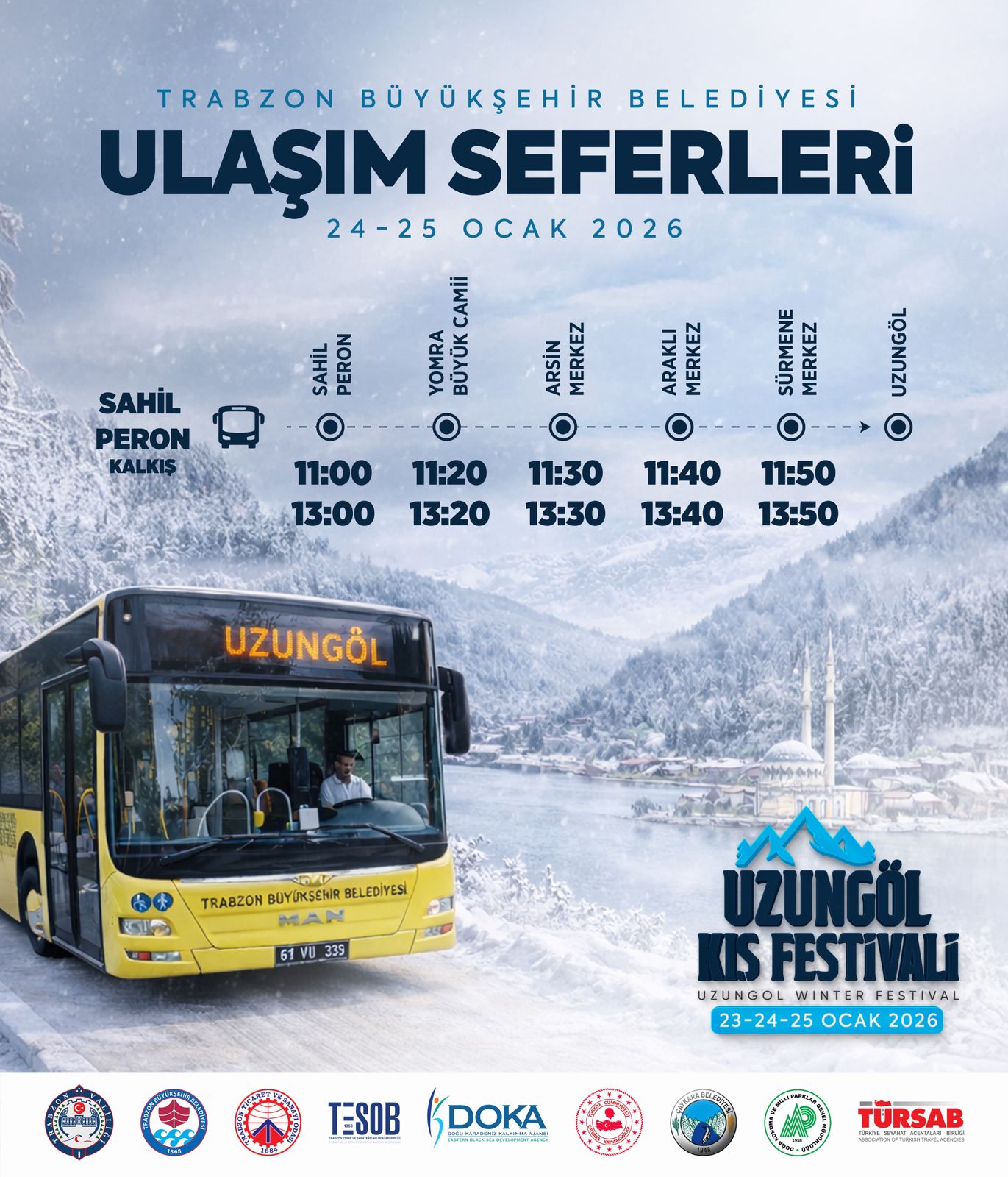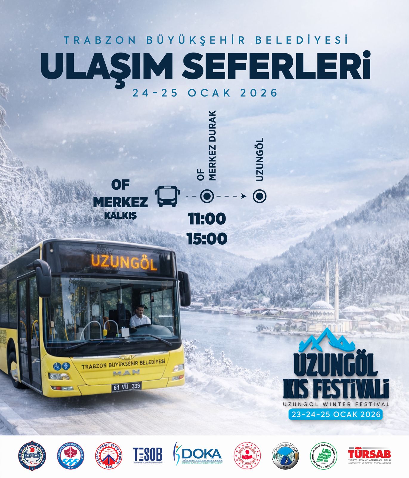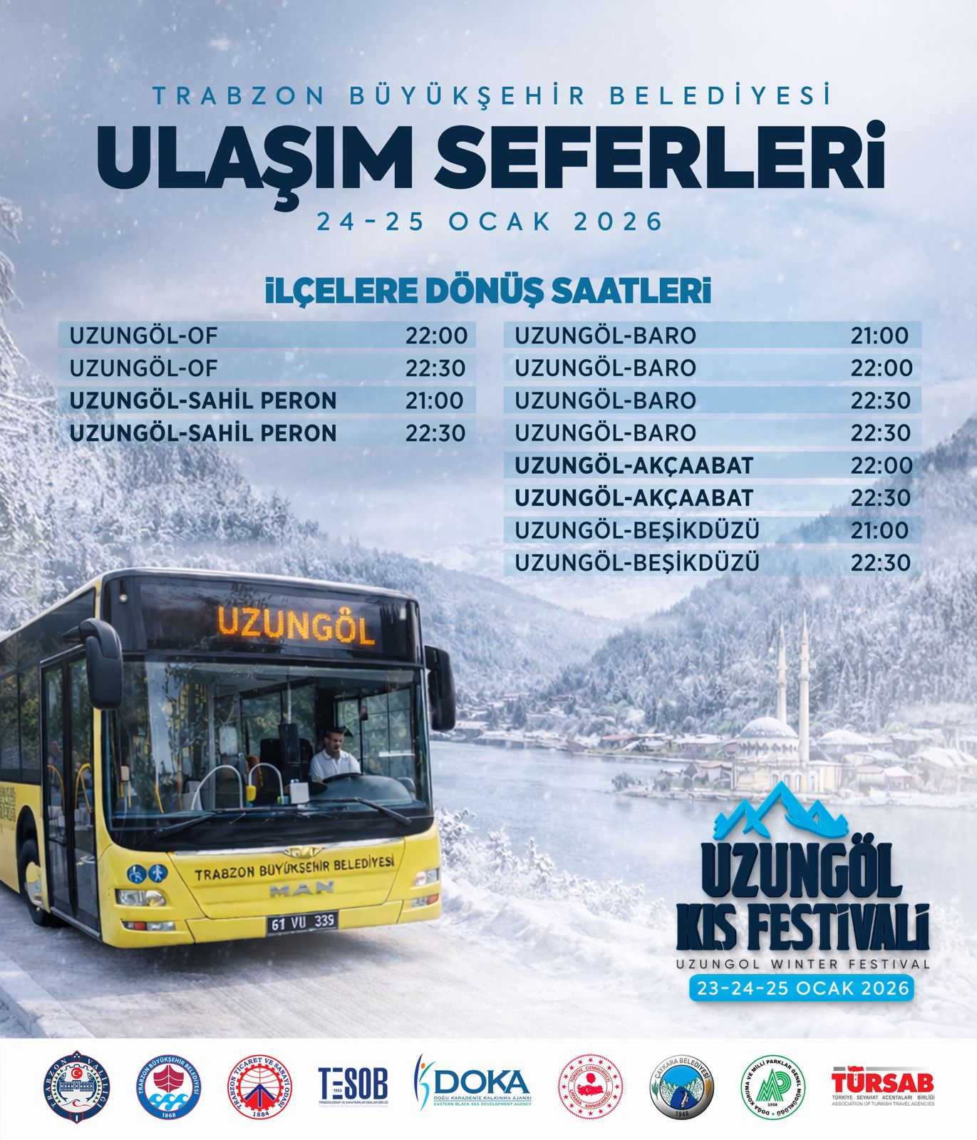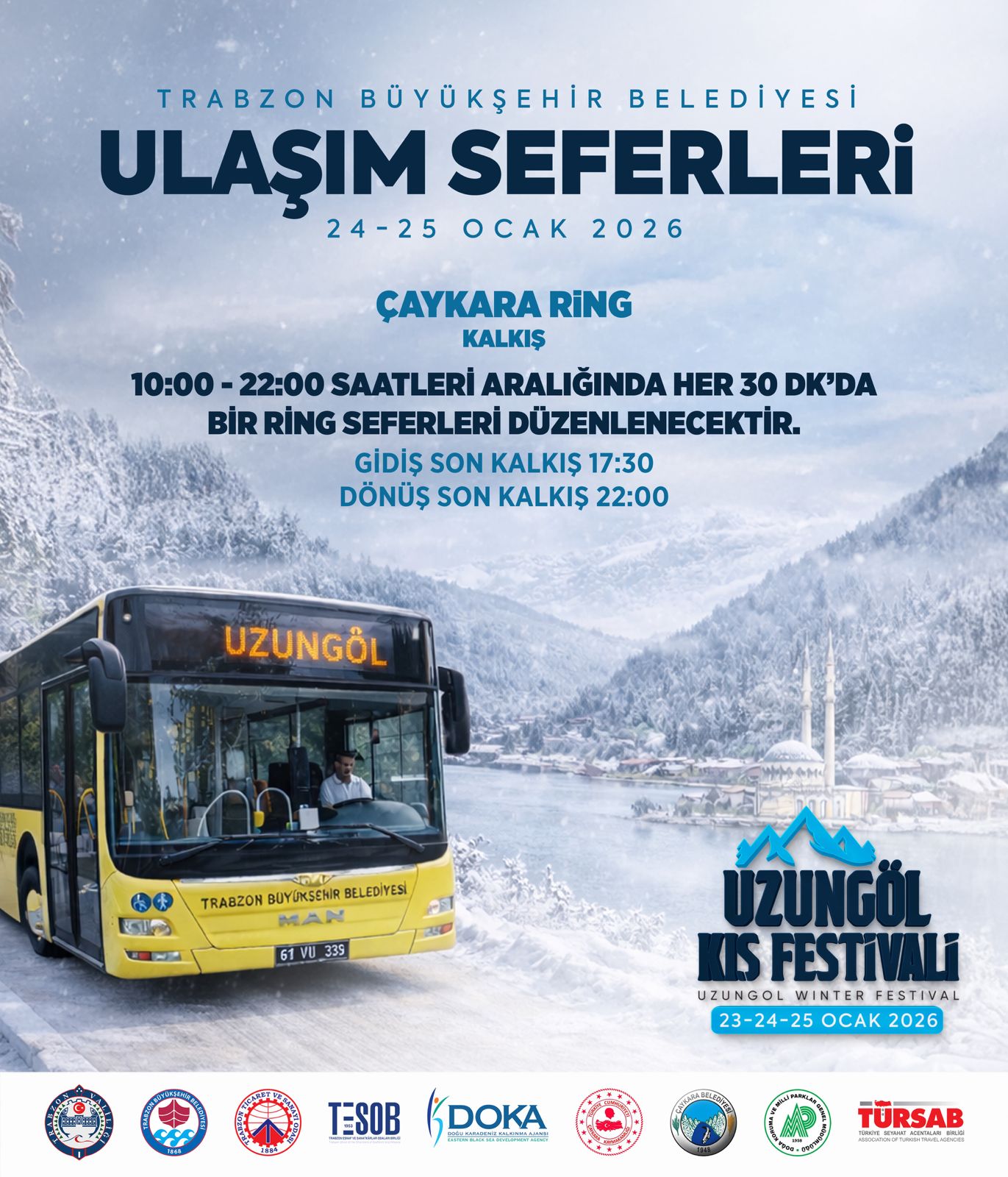 BÜYÜKŞEHİR UZUNGÖL KIŞ FESTİVALİ’NE ÜCRETSİZ TAŞIYACAKTrabzon Büyükşehir Belediyesi, 23-25 Ocak'ta düzenlenecek olan Uzungöl Kış Festivali’ne katılmak isteyen vatandaşlar için 24 ve 25 Ocak'ta ücretsiz otobüs seferleri düzenleyecek.Trabzon Büyükşehir Belediyesi iş birliğinde, bu yıl ilki düzenlenecek "Uzungöl Kış Festivali" 23-25 Ocak tarihleri arasında gerçekleştirilecek. Büyükşehir Belediyesi, festivale katılmak isteyen vatandaşların ulaşımını kolaylaştırmak amacıyla 24 ve 25 Ocak günlerinde ücretsiz otobüs seferleri düzenleyecek. UZUNGÖL’E GİDİŞ SAATLERİ