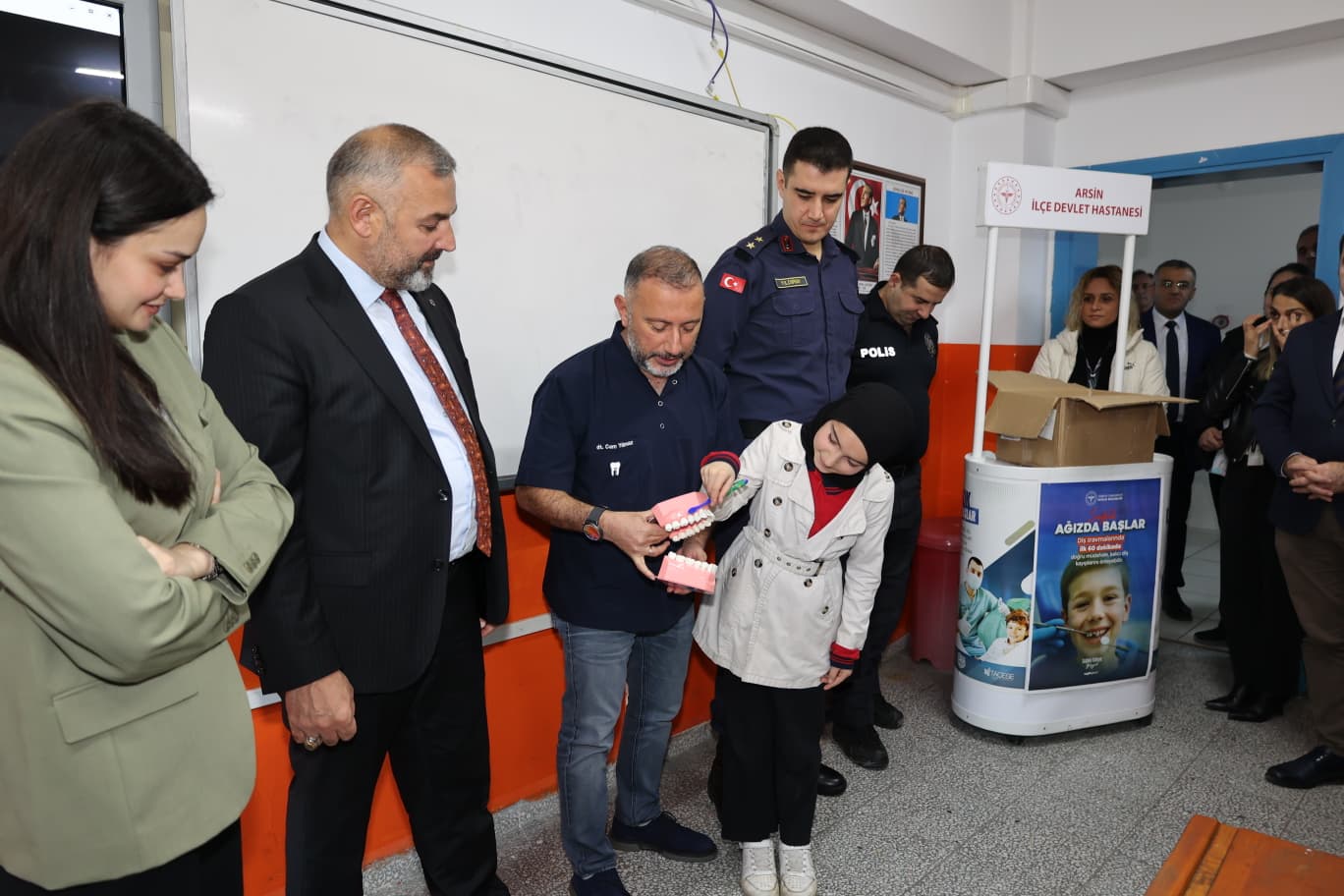 DOĞRU ALIŞKANLIKLAR ERKEN YAŞTA BAŞLARArsin Belediye Başkanı Hamza Bilgin, Arsin Kaymakamı Şule Demirtaş ile birlikte, Ağız ve Diş Sağlığı Haftası kapsamında Arsin İlçe Devlet Hastanesi tarafından düzenlenen bilgilendirme etkinliğine katıldı. Atayurt İmam Hatip Ortaokulu ile Atayurt Alparslan İlkokulu’nda gerçekleştirilen programda öğrencilere ağız ve diş sağlığının önemi anlatıldı. Etkinlik kapsamında hekimler tarafından doğru fırçalama teknikleri, ağız bakımının günlük yaşam içindeki yeri ve düzenli diş hekimi kontrolünün neden gerekli olduğu üzerine sunumlar yapıldı.EN TEMEL UNSUREtkinlikte öğrencilere hitap eden Başkan Bilgin, sağlıklı yaşamın en temel unsurlarından birinin ağız ve diş sağlığı olduğunu vurgulayarak, “Sevgili öğrenciler, diş sağlığı sadece güzel bir gülümseme için değil, genel sağlığınız için çok önemlidir. Sizlerin erken yaşlarda doğru alışkanlıklar kazanması bizim için çok kıymetlidir.” dedi. Başkan Bilgin, konuşmasının ardından öğrencilere diş fırçası ve diş macunu hediye ederek sağlıklı alışkanlıkların teşvik edilmesi gerektiğini dile getirdi.