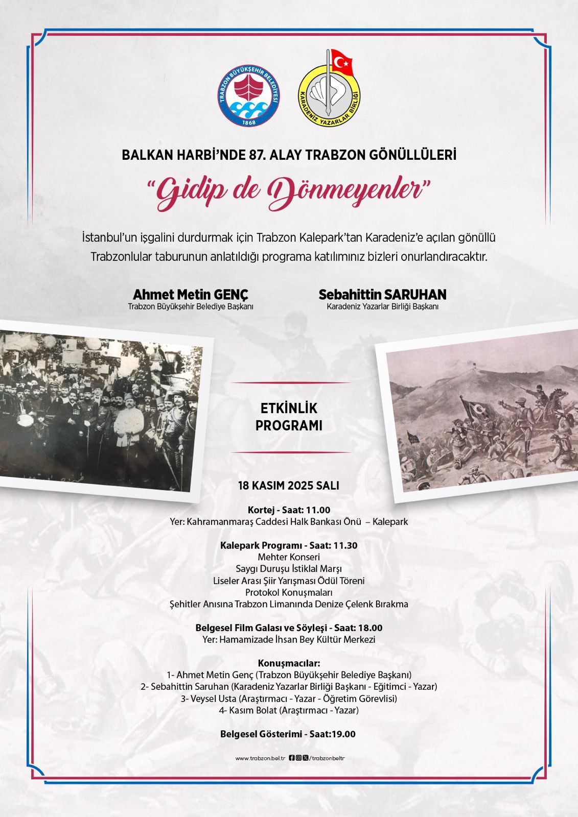 Balkan Harbi'nin 511 Trabzonlu şehidi unutulmadıGİDİP DE DÖNMEYENLER DUALARLA ANILACAKBalkan Harbi sırasında İstanbul'un işgalini durdurmak için 87. Alay'a katılan Trabzon Gönüllüleri Taburu'nun 511 şehidi, Trabzon Büyükşehir Belediyesi ve Karadeniz Yazarlar Birliği'nce anılacak. Büyükşehir Belediye Başkanı Ahmet Metin Genç, şehirde yaşayan herkesi anma programına davet ederek, "Kahraman ecdadımıza vefa için buluşalım" dedi.Trabzon Büyükşehir Belediyesi ve Karadeniz Yazarlar Birliği iş birliğinde, Balkan Harbi sırasında 87. Alay bünyesinde yer alan Trabzon Gönüllüler Taburu’nun 511 şehidini anmak amacıyla 'Gidip de Dönmeyenler' adlı etkinlik düzenlenecek. Trabzon Gönüllüler Taburu’nun İstanbul’un işgalini durdurmak için deniz yoluyla savaşa uğurlandığı Kalepark’ta gerçekleştirilecek program, 18 Kasım 2025 Salı günü (yarın) saat 11.00’de Kahramanmaraş Caddesi’nden Kalepark'a gerçekleştirilecek kortej yürüyüşü ile start alacak. Kalepark’taki anma programı ve Trabzon Limanı'nda denize şehitler anısına çelenk bırakılmasının ardından saat 18.00'de Hamamizade İhsan Bey Kültür ve Sanat Merkezi’nde, Büyükşehir Belediye Başkanı Ahmet Metin Genç, Karadeniz Yazarlar Birliği Başkanı Sebahattin Saruhan ile araştırmacı yazarlar Veysel Usta ve Kasım Bolat'ın konuşmacı olarak katılacağı söyleşi gerçekleştirilecek. Saat 19.00'da ise 'Gidip de Dönmeyenler' adlı belgeselin gösterimi yapılacak.ECDADA VEFA İÇİN BULUŞALIM