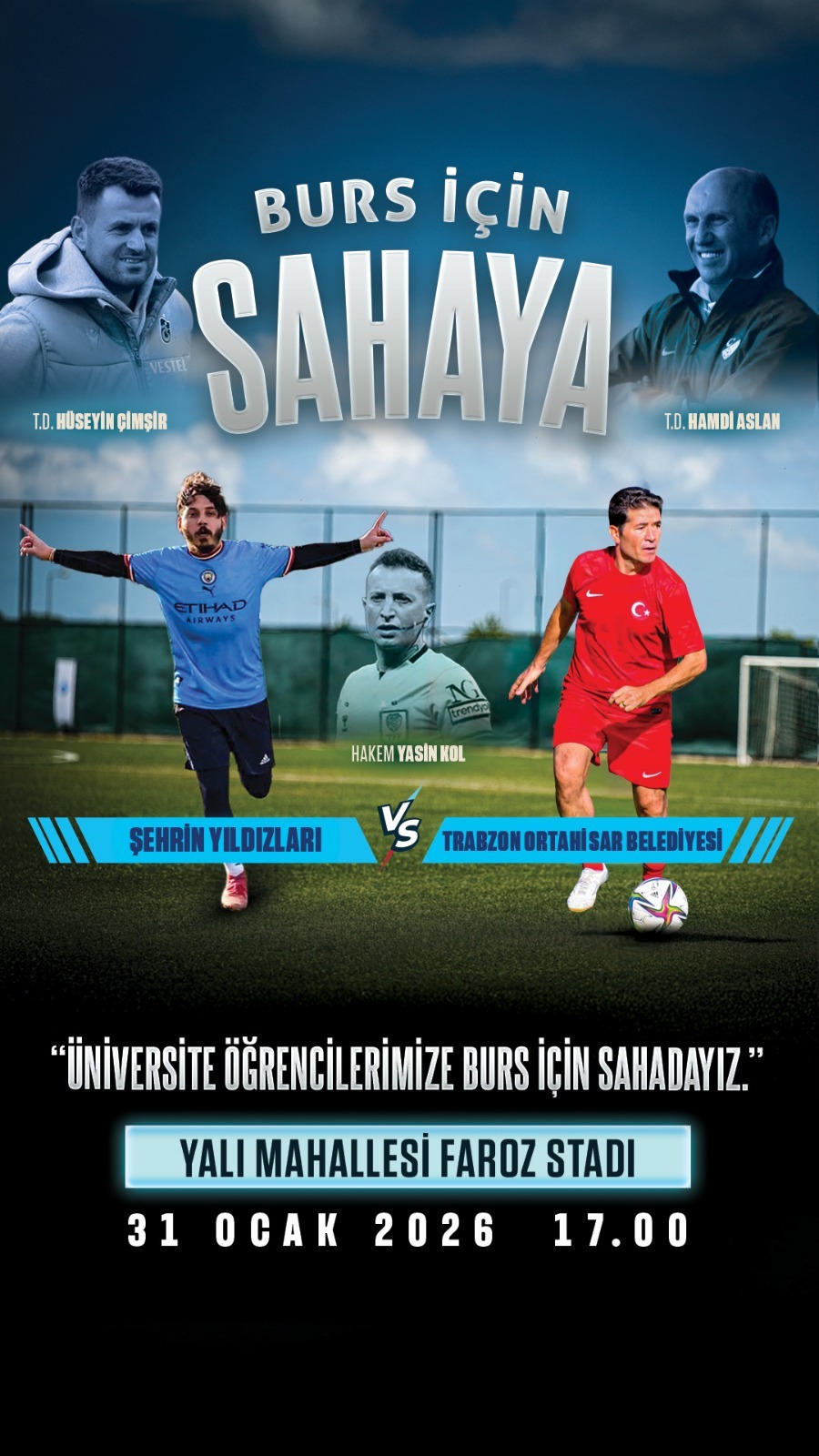Ortahisar Belediye Başkanı Ahmet Kaya’nın ekonomik zorluk çeken üniversite öğrencileri için başlattığı burs kampanyasına destekler her geçen gün artarak devam ediyor. “Burs İçin Sahaya” sloganıyla dijital içerik üreticisi Samet Öztürk’ün organizasyonunda gerçekleştirecek maçta, sosyal medya fenomenleri ve bağışçı iş insanlarının oluşturacağı ‘Şehrin Yıldızları’ takımı ile Başkan Ahmet Kaya’nın belediye müdür ve personeliyle yer alacağı Ortahisar Belediyesi takımı karşı karşıya gelecek. Üniversiteli gençlerin eğitim yolculuğuna katkı sunmak için düzenlenen karşılaşmada Trabzonspor’un efsane futbolcularından Hüseyin Çimşir, Şehrin Yıldızları’nın; Hamdi Aslan da Ortahisar Belediyesi’nin antrenörü olarak sahaya çıkacak. 31 Ocak Cumartesi günü, saat 17.00’de Yalı Mahallesi Faroz Sahasında oynanacak karşılaşmada Süper Lig hakemi Yasin Kol düdük çalacak. Anlamlı organizasyonda burs bağışında bulunan iş insanlarının firma logoları, karşılaşmada giyilecek formalarda ve reklam standında yer alacak. BAŞKAN KAYA: “BÜTÜN HAYIRSEVERLERİMİZİ ORGANİZASYONUMUZA DESTEK OLMAYA DAVET EDİYORUM”