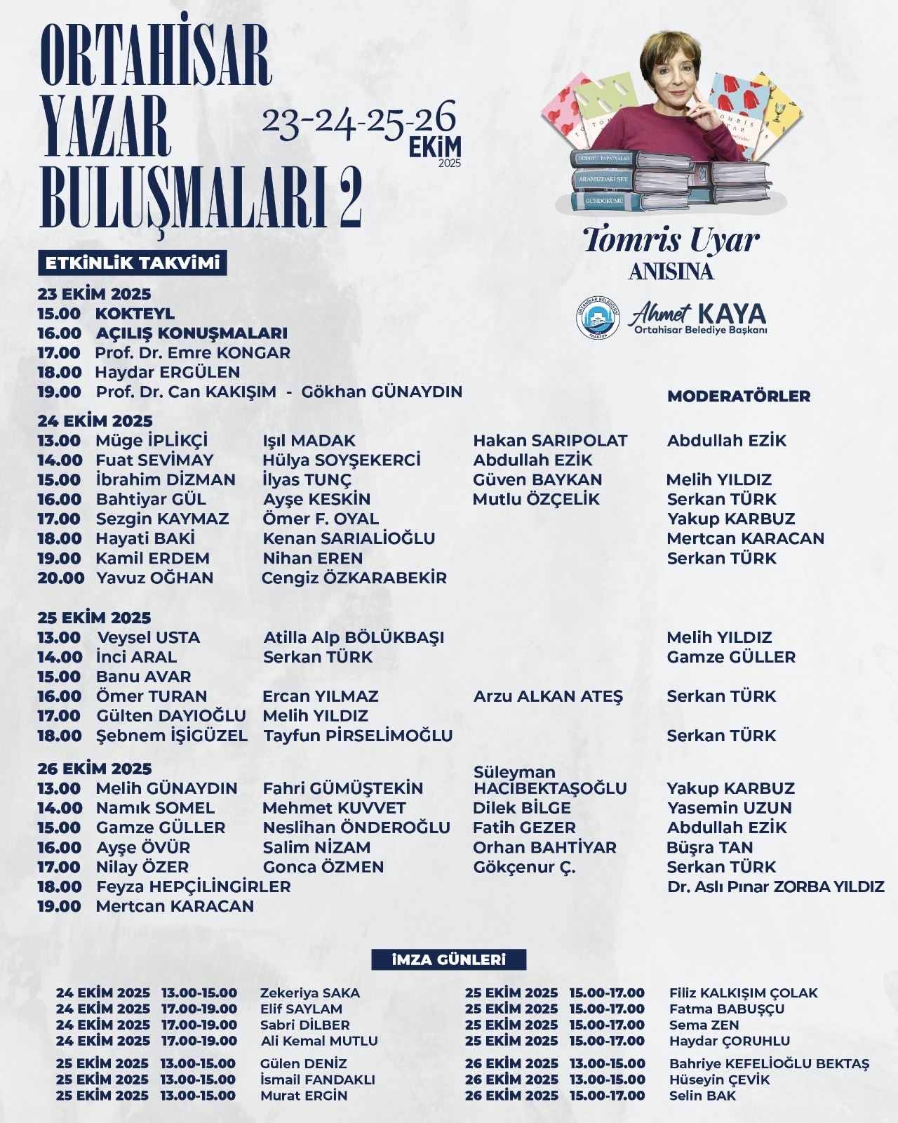 Ortahisar Belediyesi tarafından 29 Ekim Cumhuriyet Bayramı kutlamaları kapsamında düzenlenen ve geçen yıl ilki yapılan ‘Ortahisar Yazar Buluşmaları’nın ikincisi, bu yıl 23-26 Ekim 2025 tarihleri arasında gerçekleştirilecek. Geçen yıl Hasan İzzettin Dinamo anısına düzenlenen Ortahisar Yazar Buluşmaları, bu yıl Türk öykücülüğünün usta kalemi, yazar ve çevirmen Tomris Uyar anısına düzenlenecek. Etkinlik kapsamında birbirinden değerli 68 yazar ve şair, söyleşi, dinleti ve imza günleriyle dinleyici ve okurlarla buluşacak. Ortahisar Belediye Başkanı Ahmet Kaya'nın öncülüğünde oluşturulan Düzenleme Komitesi, Melih Yıldız, Serkan Türk, Olgun Önder ve Erdal Eksert’ten oluşuyor. 68 YAZAR VE ŞAİR, SÖYLEŞİ VE DİNLETİLERDE, DAVETLİLERLE BULUŞACAK