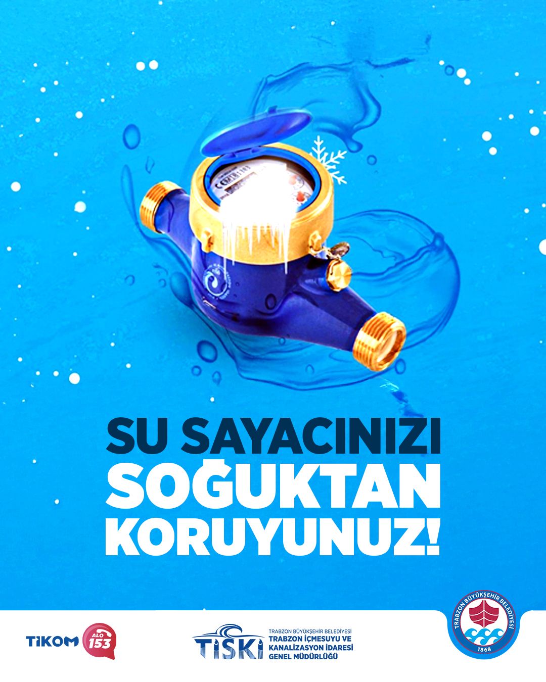 SAYAÇ DONMALARINA DİKKATTrabzon Büyükşehir Belediyesi TİSKİ Genel Müdürlüğü, soğuk havalarda su sayaçlarının donma tehlikesine karşı abonelerini uyardı.