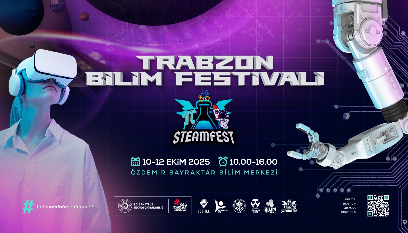 TRABZON BİLİM FESTİVALİ’NE HAZIR Trabzon Büyükşehir Belediyesi, bilim ve teknolojiye olan ilgiyi artırmak amacıyla, 10-12 Ekim 2025 tarihleri arasında Bilim Festivali düzenleyecek. Trabzon Büyükşehir Belediyesi önemli bir etkinliğe imza atmaya hazırlanıyor. Bilim ve teknolojiye olan ilgiyi artırmak, öğrencilerin bilimsel düşünme becerilerini geliştirmek, bilim, teknoloji, mühendislik, sanat ve matematik alanlarında yaratıcı, yenilikçi çözümler üretmelerine katkı sağlamak ve teşvik etmek amacıyla, 10-12 Ekim 2025 tarihleri arasında Özdemir Bayraktar Bilim Merkezinde geniş katılımlı Bilim Festivali düzenlenecek. Merakla beklenen festival 10 Ekim Cuma günü saat 10:00’ da başlayacak. TÜBİTAK 4007- Bilim Şenlikleri Destekleme Programı kapsamında desteklenen 125B807 proje kodlu "STEAMFEST TRABZON-Bilimle Büyüyen Zihinler" başlıklı bilim şenliği her yaş grubundan katılımcıya hitap edecek. Zengin bir içeriğe sahip olan bilim şenliği kapsamında, bilim söyleşileri, deneysel atölyeler, yaratıcı drama etkinlikleri, bilimsel şovlar, canlı heykeller, bilim tiyatroları, planetaryum gösterimleri, teknoloji sergileri ve simülasyonlar gibi etkinlikler yer alacak. 3 gün sürecek şenliğe, Trabzon ve çevre illerden yaklaşık 70 bin kişinin katılması bekleniyor. BAŞKAN GENÇ: HERKESİ BEKLİYORUZ