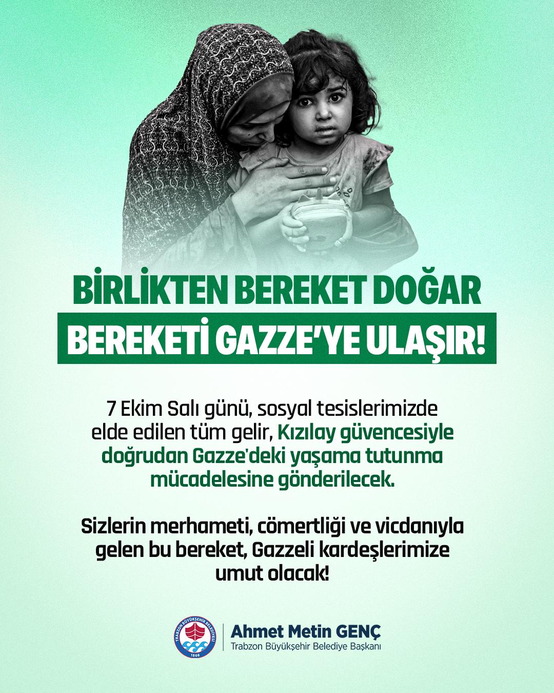 TRABZON BÜYÜKŞEHİR BELEDİYESİ’NDEN GAZZE’YE ANLAMLI DESTEKTrabzon Büyükşehir Belediyesi, soykırıma uğrayan Gazze halkı için başlattığı yardım seferberliğini sürdürüyor. Bu kapsamda, yarın belediyeye bağlı tüm sosyal tesislerde elde edilecek gelirler, Kızılay güvencesiyle doğrudan Gazze’ye ulaştırılacak.Trabzon Büyükşehir Belediyesi, işgalci İsrail'in soykırım uyguladığı Gazze halkına yönelik yardım seferberliğini sürdürüyor. Büyükşehir Belediye Başkanı Ahmet Metin Genç’in büyük hassasiyet gösterdiği bu insanlık dramında, yaşama hakkı ellerinden alınan Gazze halkı için yeni bir destek kampanyası hayata geçiriliyor. “Birlikten bereket doğar, bereket Gazze’ye ulaşır” sloganıyla başlatılan kampanya kapsamında, yarın (7 Ekim Salı) Büyükşehir Belediyesi’ne bağlı tüm sosyal tesislerde elde edilecek gelir, Kızılay güvencesiyle doğrudan Gazze’ye ulaştırılacak. Trabzon halkının desteğiyle toplanan her kuruş, Gazze’de hayatta kalma mücadelesi veren mazlumlara umut olacak.ANLAMLI DAYANIŞMA