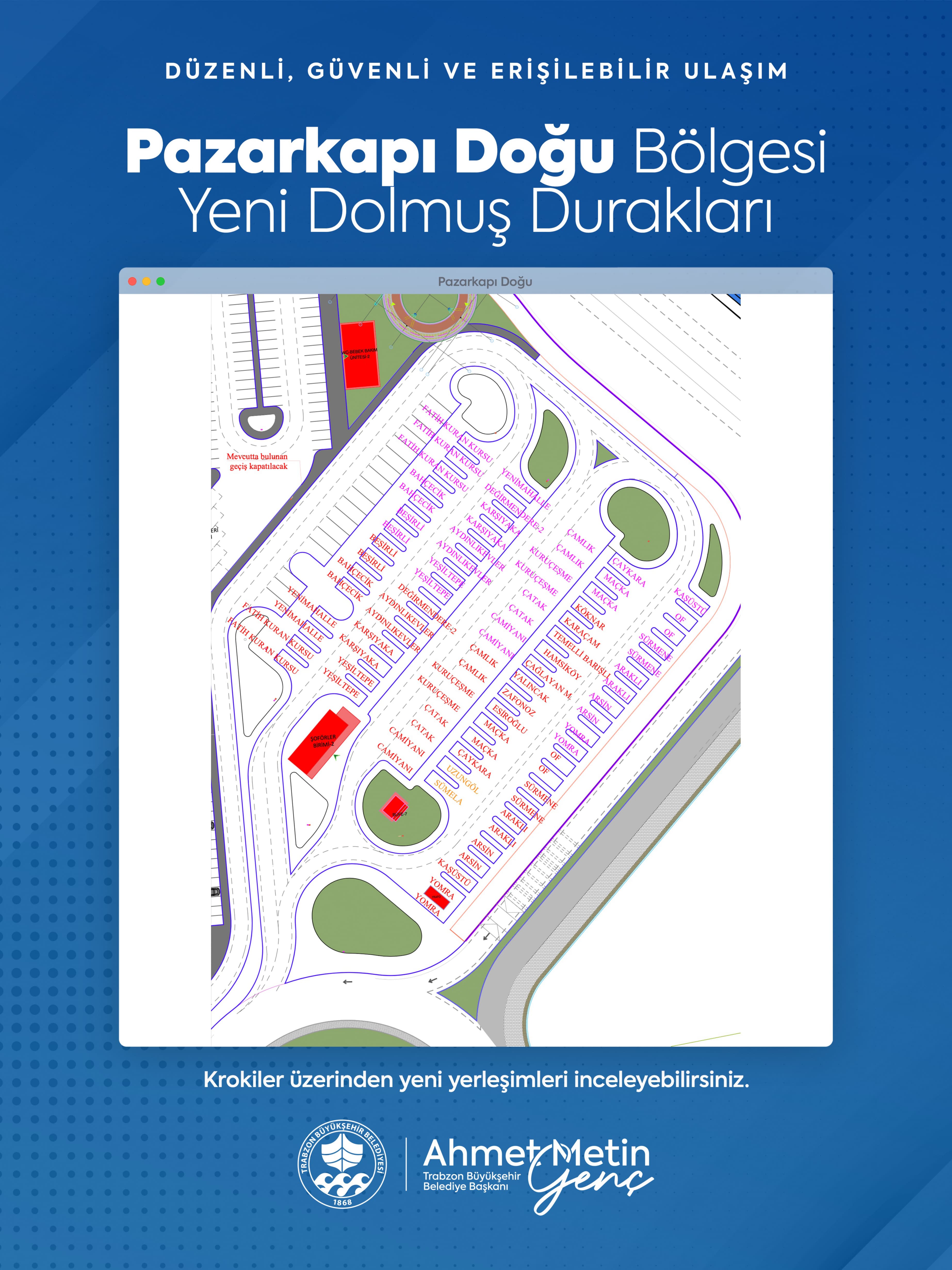 Pazarkapı depolama alanının doğu bölümünde Kuran Kursu, Bahçecik, Beşirli, Yenimahalle, Değirmendere, Karşıyaka, Aydınlıkevler, Yeşiltepe, Çamlık, Kuruçeşme, Çatak, Camiyanı, Çaykara, Maçka, Köknar, Karaçam, Temelli, Barışlı, Hamsiköy, Çağlayan, Yalıncak, Zafanos, Esiroğlu, Uzungöl, Sümela, Kaşüstü, Of, Sürmene, Araklı, Arsin ve Yomra dolmuş hatları yer alıyor. Batı bölümünde ise TOKİ Yıldızlı, Pınaraltı Sayvan, Aktoprak, Karlık, Gürpınar, Mağmat, Tosköy, Karakaya, Akkaya, Subaşı, Kireçhane, Yeniköy, Uğurlu, Derecik, Tonya, Akçaköy, Cevizlik, Maden, Ağıllı, Doğançay, Uçarsu, Çukurca, Demirtaş, Düzköy, Beşikdüzü, Vakfıkebir, Çarşıbaşı ve Akçaabat dolmuş hatları konuşlandırıldı.VATANDAŞLARDAN OLUMLU GERİ DÖNÜŞ